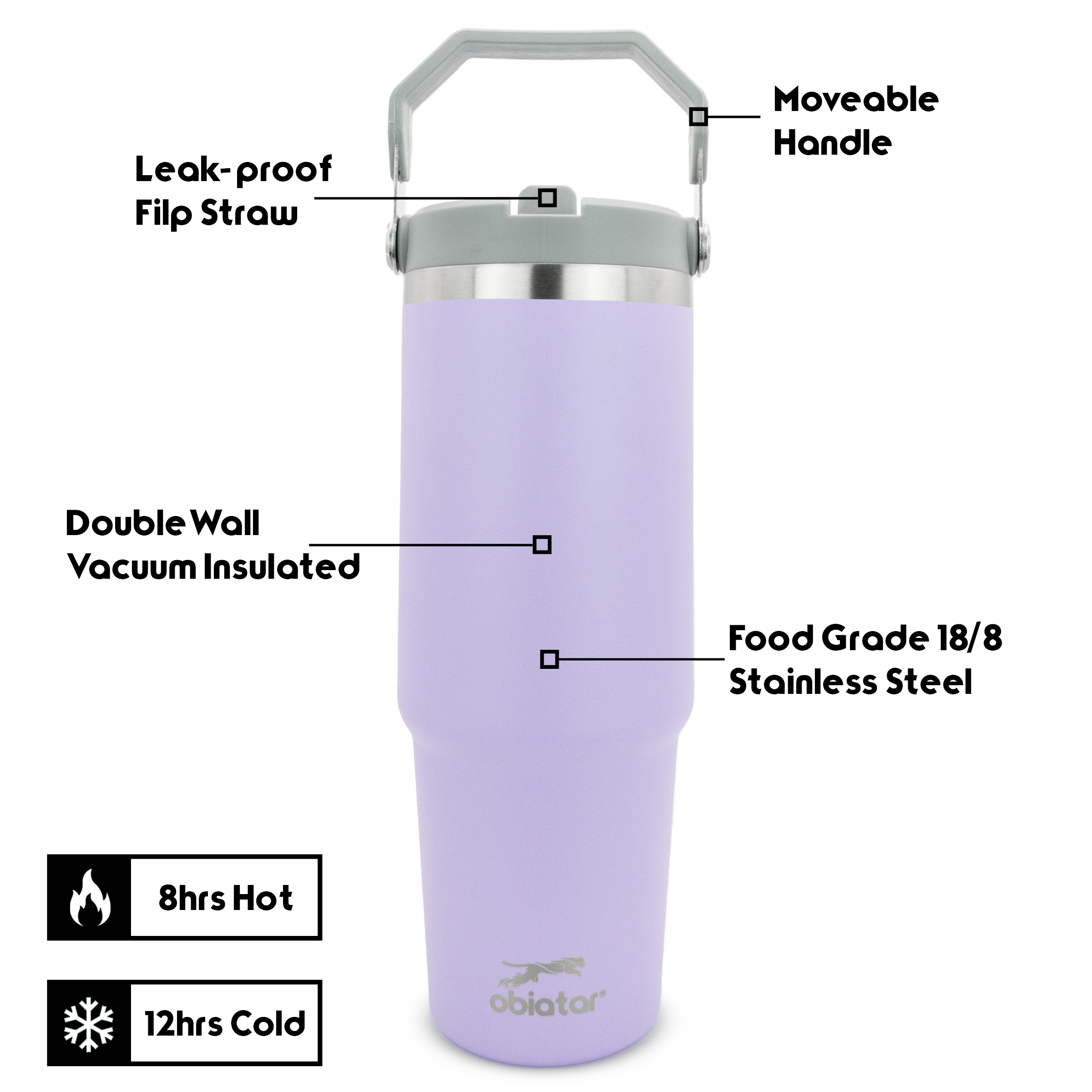 Stay hydrated in style with this premium 30 oz tumbler, featuring a convenient handle for easy carrying. Crafted from food-grade 18/8 stainless steel with double-wall vacuum insulation, this tumbler excels at maintaining your beverage's temperature, whether hot or cold. The practical design includes a flip straw lid for comfortable sipping and a movable soft handle for enhanced portability. The 100% leak-proof construction ensures worry-free transport in your bag or car. This versatile tumbler is perfect for daily use, from morning coffee runs to afternoon workouts or outdoor adventures. The durable construction and sleek finish make it an ideal companion for both everyday use and travel. The BPA-free materials ensure your drinks remain pure and fresh-tasting. This 30 oz capacity tumbler strikes the perfect balance between size and portability, making it suitable for long days out or office use.