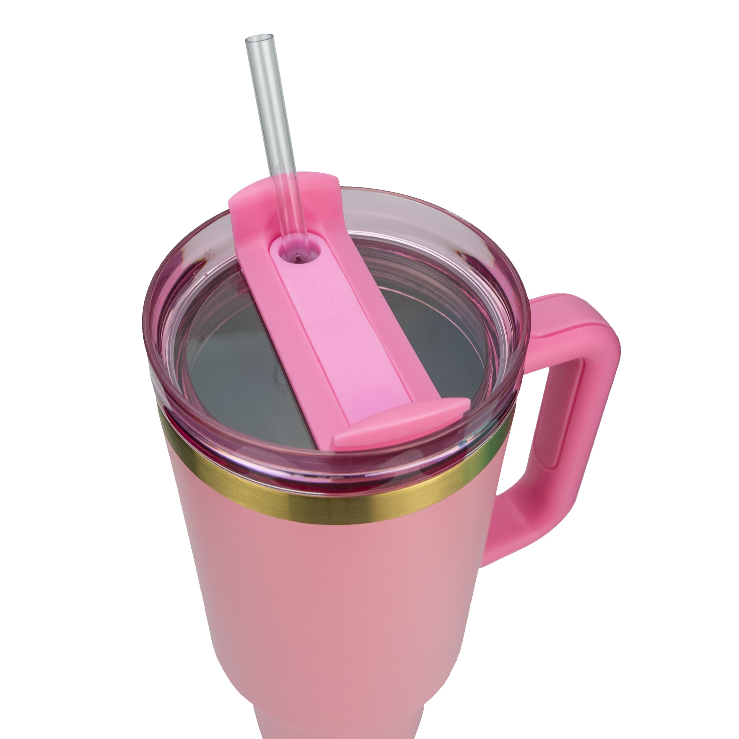 Obiatar 40oz Stainless Steel Travel Tumbler With Gold Accent| Double-Wall Vacumm Insulated Tumbler With Straw, Lid & Handle (Light Pink)